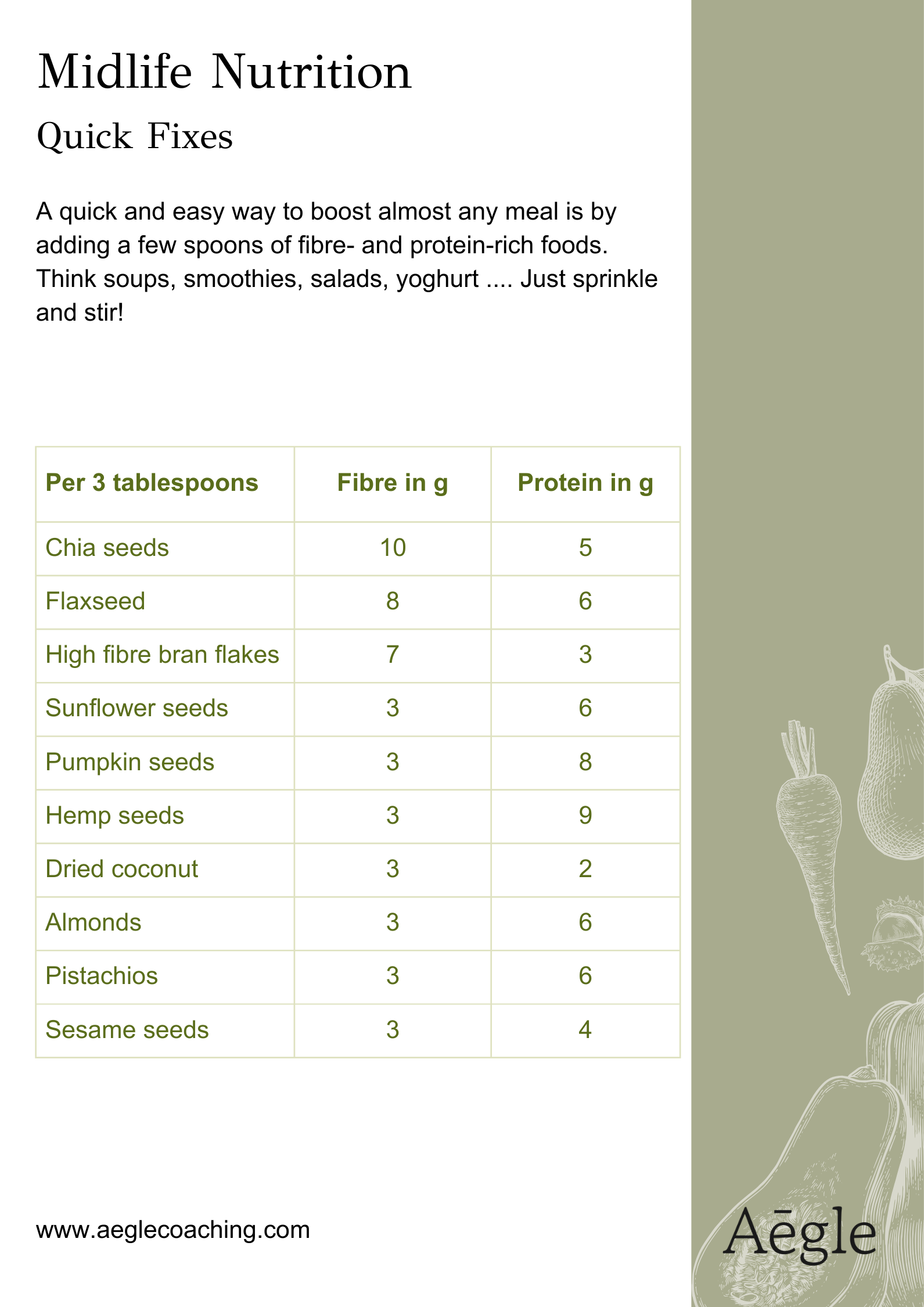 However, you can boost almost any meal by sprinkling a few tablespoons of fibre- and protein-rich foods from the list below.